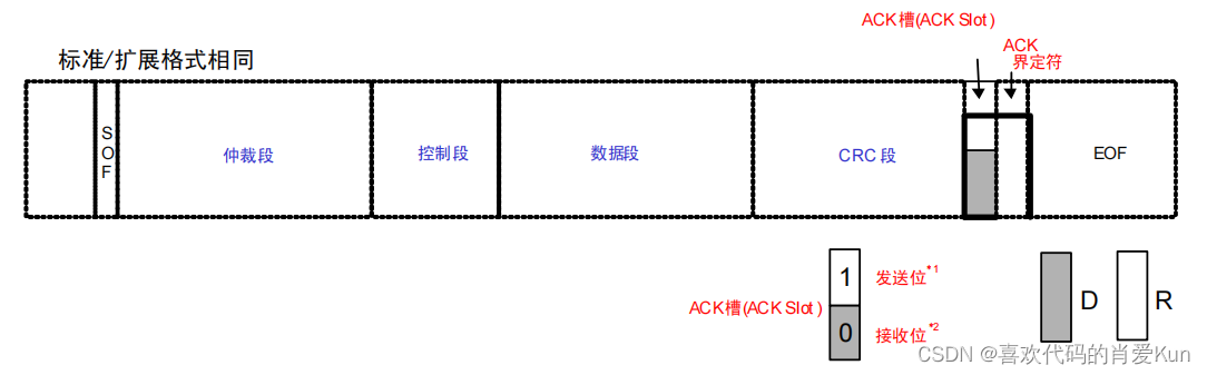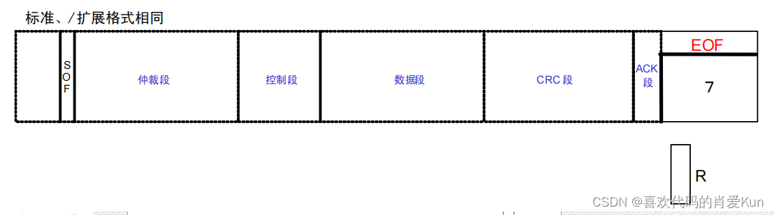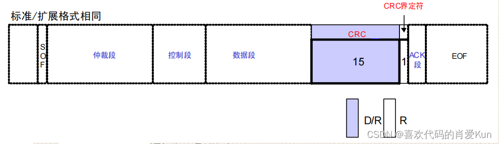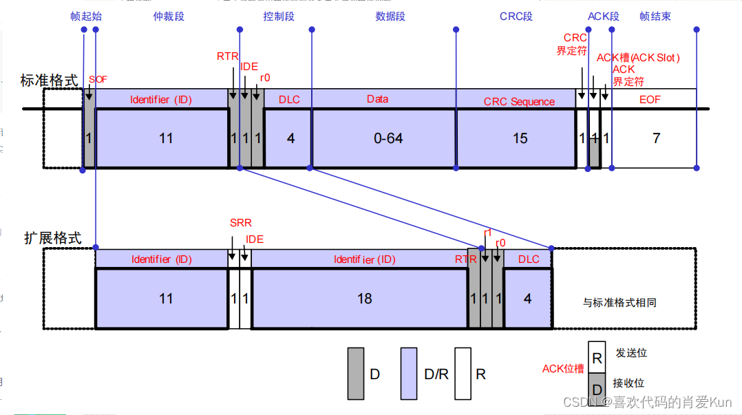 标准数据帧的仲裁部分由11位ID和1位RTR位组成,用于区分数据帧(例如光栅)和远程帧