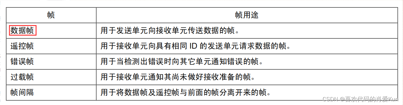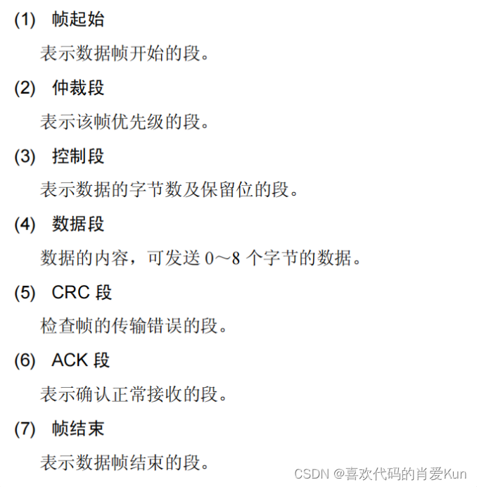 CAN使用了五个通信帧,下面以数据帧为例