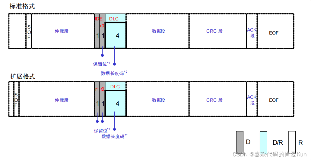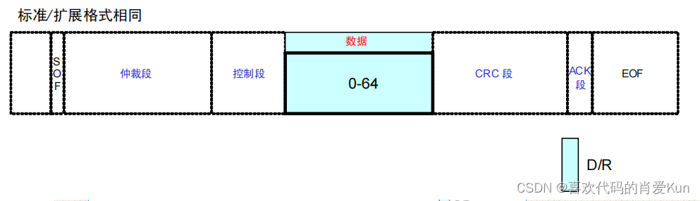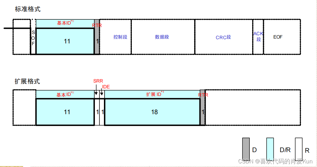 数据帧分为两个格式:标准数据帧和扩展数据帧。