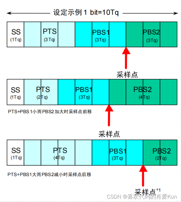 接收器的采样必须在PBS1和PBS2之间,由于SS和PTS错误的变化,PBS补偿也会随着错误的变化而改变,达到固定传输时间,而SJW则为PBS补偿进行二次补偿。