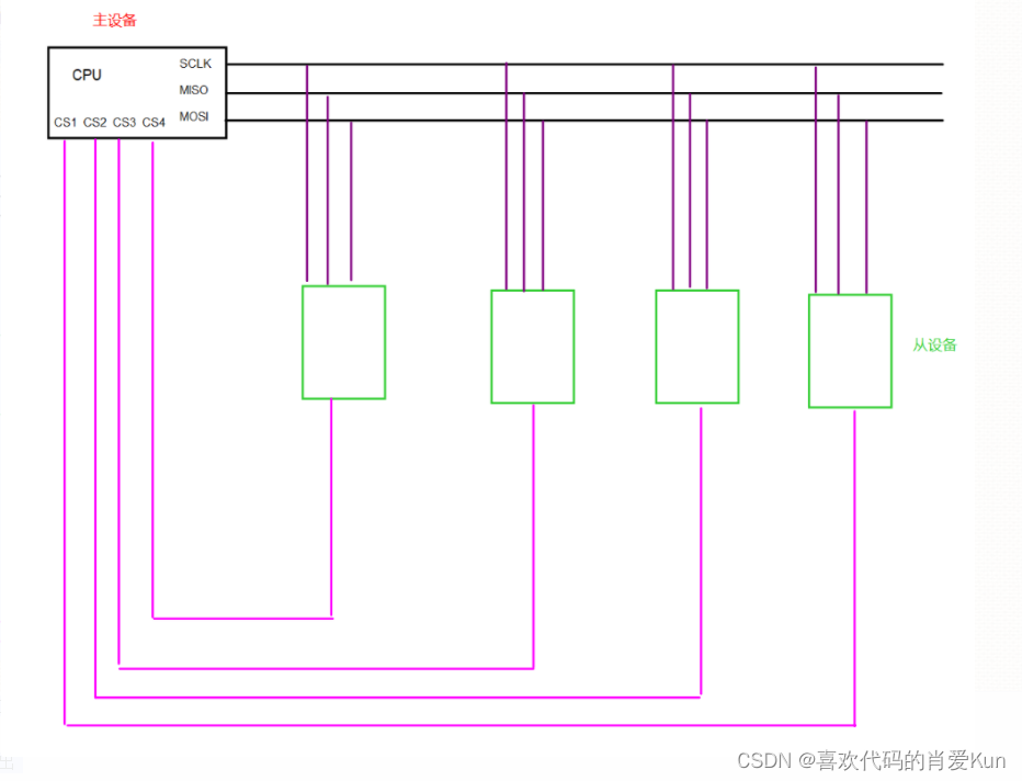 主设备控制,用于选择当前通信的从设备 ,一个 Slave 设备要想能够接收到 Master 发过来的控制信号, 必须在此之前能够被 Master 设备进行访问 (Access),所以, Master 设备必须首先通过 CS对 Slave 设备进行片选, 把想要访问的 Slave 设备选上.