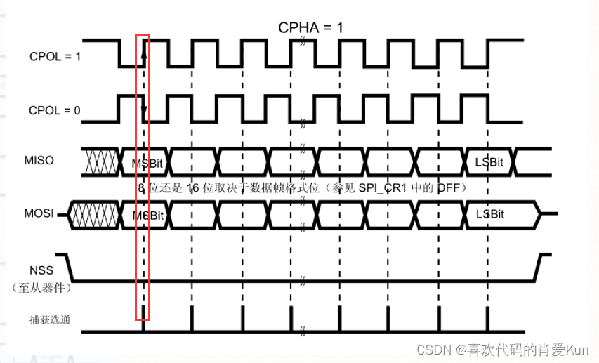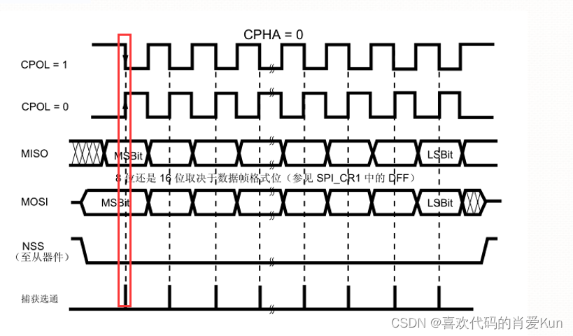CPOL表示高低电平顺序,叫做极性;若CPOL = 0,串行同步时钟的空闲状态为低电平;