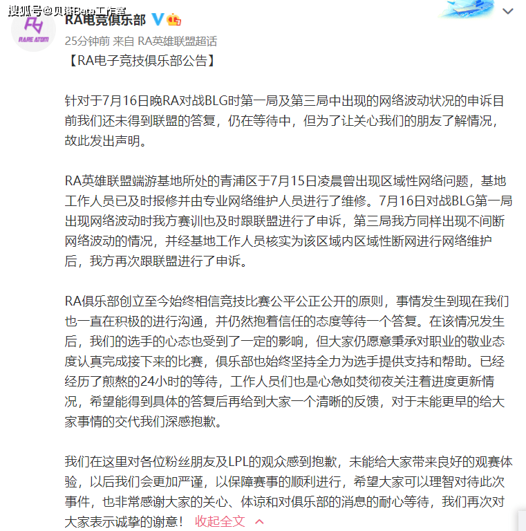 RA 内阁 的 声明 如下 :针对 RA 和 BLG 1 和 3 的网络问题,RA已向LPL提出正式投诉,但尚未收到任何回应。之后RA解释,网络波动的出现并不是俱乐部本身的原因,这是由于位于青浦区的区域网络维护。最后就是RA表示希望比赛可以公平公正,自从这件事发生以来,我们一直在积极沟通,这位运动员的心脏病虽然受到影响,可是,为了我的荣誉,我完成了所有的比赛,现在已经24小时了,直到官方回应为止,因此,RA方面未能向观众提供答案。