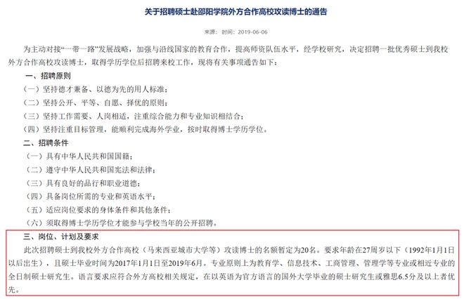 榜姐翻了翻资料,发现邵阳学院在2019年6月6日发布过一则《关于招聘硕士赴邵阳学院外方合作高校攻读博士的通告》,里面明确提到: