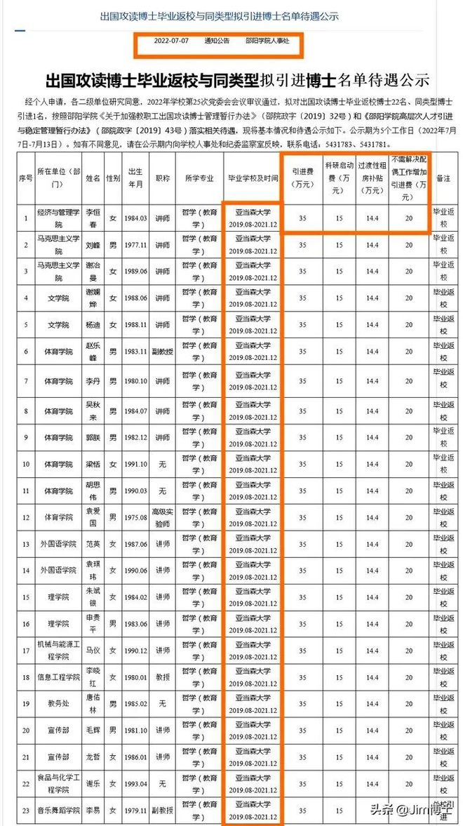 7月7日,邵阳学院人事处在学校网站发布了《出国攻读博士毕业返校与同类型拟引进博士名单待遇公示》,准备引进23名博士。