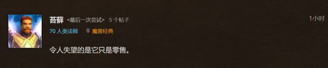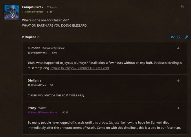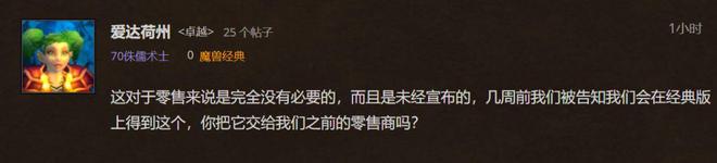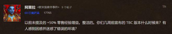 “好多怀旧服的玩家都已经AFK了,除非这个buff开放。就像宣布WLK怀旧服之后,太阳之井高地的操作突然间就没有了一样。快来个时间表吧,箭在弦上了!”