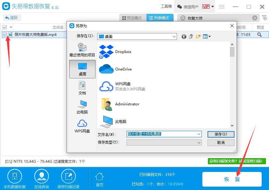 扫描完成后,您可以双击预览,选择要恢复的文件,然后选择它,选择要恢复的频道,文件将被恢复。
