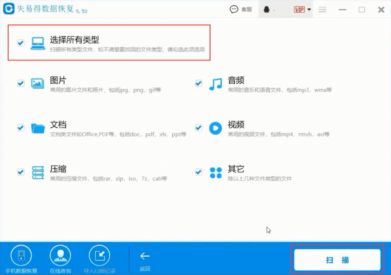 为了进行更全面的扫描,建议选择所有类型,并根据你的情况选择相应的类型。