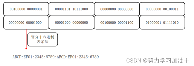 IPv6被分成八个整数,每个整数由四个16位元位数表示,并由一个缩写(:)分开。