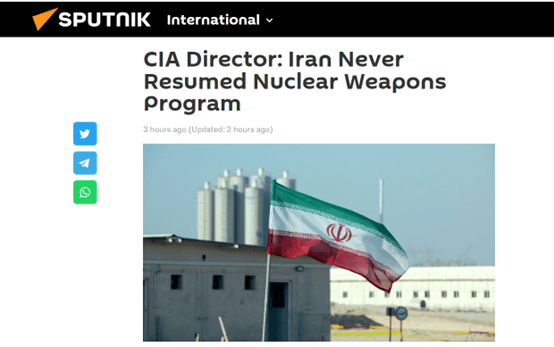 【环球网报道 记者 张晓雅】据俄罗斯卫星通讯社报道,美国中央情报局(CIA)局长威廉·伯恩斯当地时间20日表示,伊朗从未恢复其2004年放弃的核武器计划,这与华盛顿四年来的公开表态相反。
