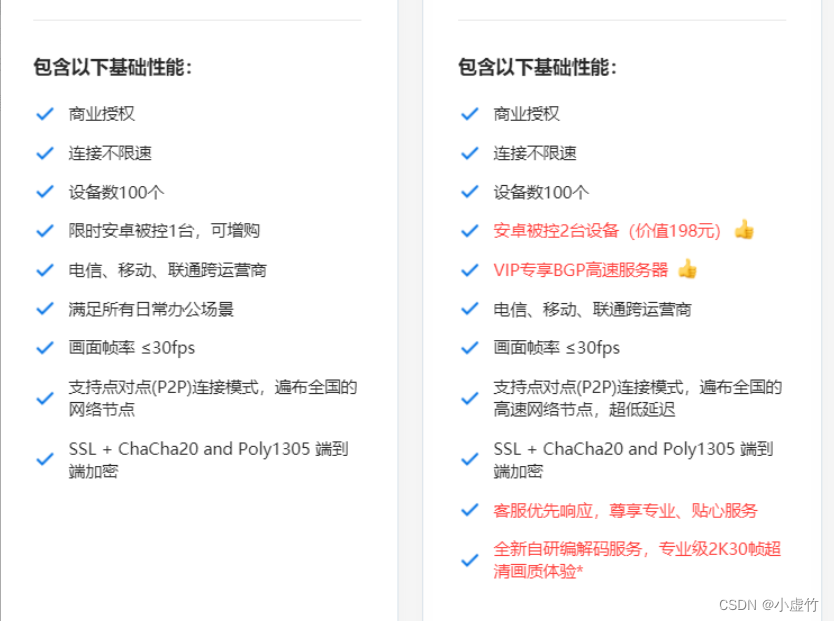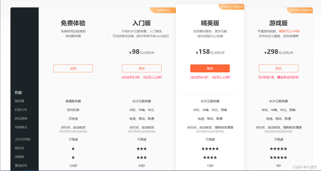 专业版本:($118/年)基于免费版本,额外的功能包括单键部署、融合模式、游戏手柄控制、移动终端扩展屏幕、享受屏幕调整、专门的客户服务和VIP-BGP高速服务器,以及在后期传输中添加新的RTC引擎技术。