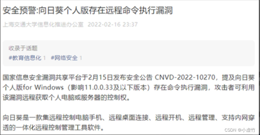 原以为向日葵是十来年的成熟软件,应该会挺安全的。但没想到有后门安全漏洞,攻击者可利用其获取服务器控制权被官方点名通报了。