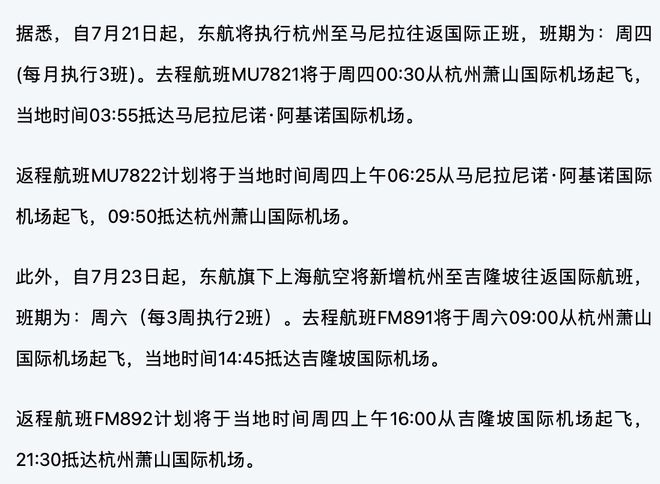 据中国民航通讯社报道,东航将于7月21日从杭州到马尼拉和吉隆坡开辟新的国际航线,为外商企业提供交通便利,并更好地满足旅客的旅行需要。