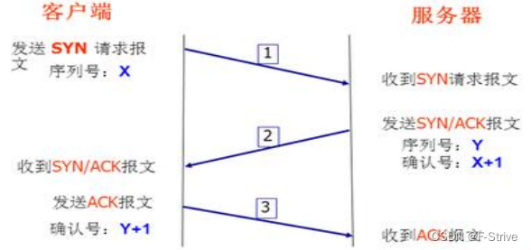 第一个握手: 客户端启动, 发送SYN请求消息, 序列: X; 服务器接收SYN请求消息.