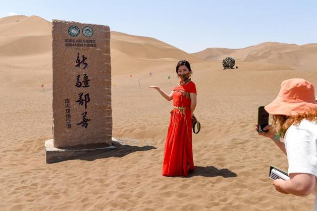 游客在新疆鄯善县库木塔格沙漠风景区留影 新华社 发