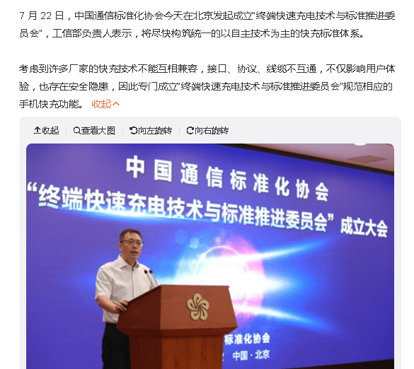 中国通信标准化协会(CSA)今日在北京成立了“提高快速充电技术和终端标准委员会”。劳工部部长表示,将尽快建立基于自主技术的统一快速充电标准系统。