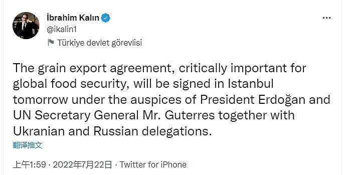 土耳其总统伊卜拉欣·卡林(Ibrahim Kalin)在Twitter上宣布,土耳其总统埃尔多安、联合国秘书长科菲·安南和俄罗斯和乌克兰代表将于星期五在伊斯坦布尔签署《黑海食品出口协定》。