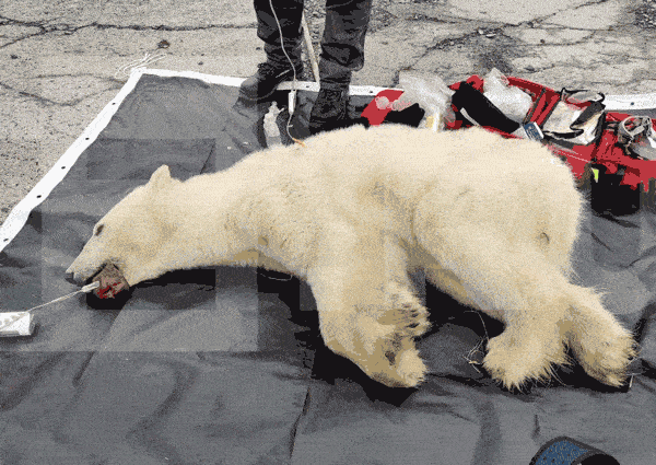 参与救援的兽医阿尔希纳斯基说,当时他们在距离迪克森机场3公里的地方发现了这只大约2岁的雌性北极熊。兽医小组顺利向它发射麻醉针后,这只熊在10分钟内就睡着了。
