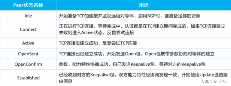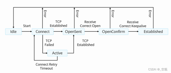 BGP的状态机描述的是BGP对等体建立过程中状态的变化。因为BGP 这个协议可以将邻居建立过程和路由收发过程分开进行。BGP的状态机---6种
