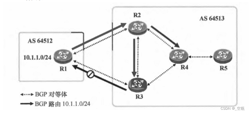 IBGP Level Splitting - 当路由器从一个IBGP等价对学习到一个特定的BGP路由时,它将无法将路由信息传递给另一个IBGP等价对。