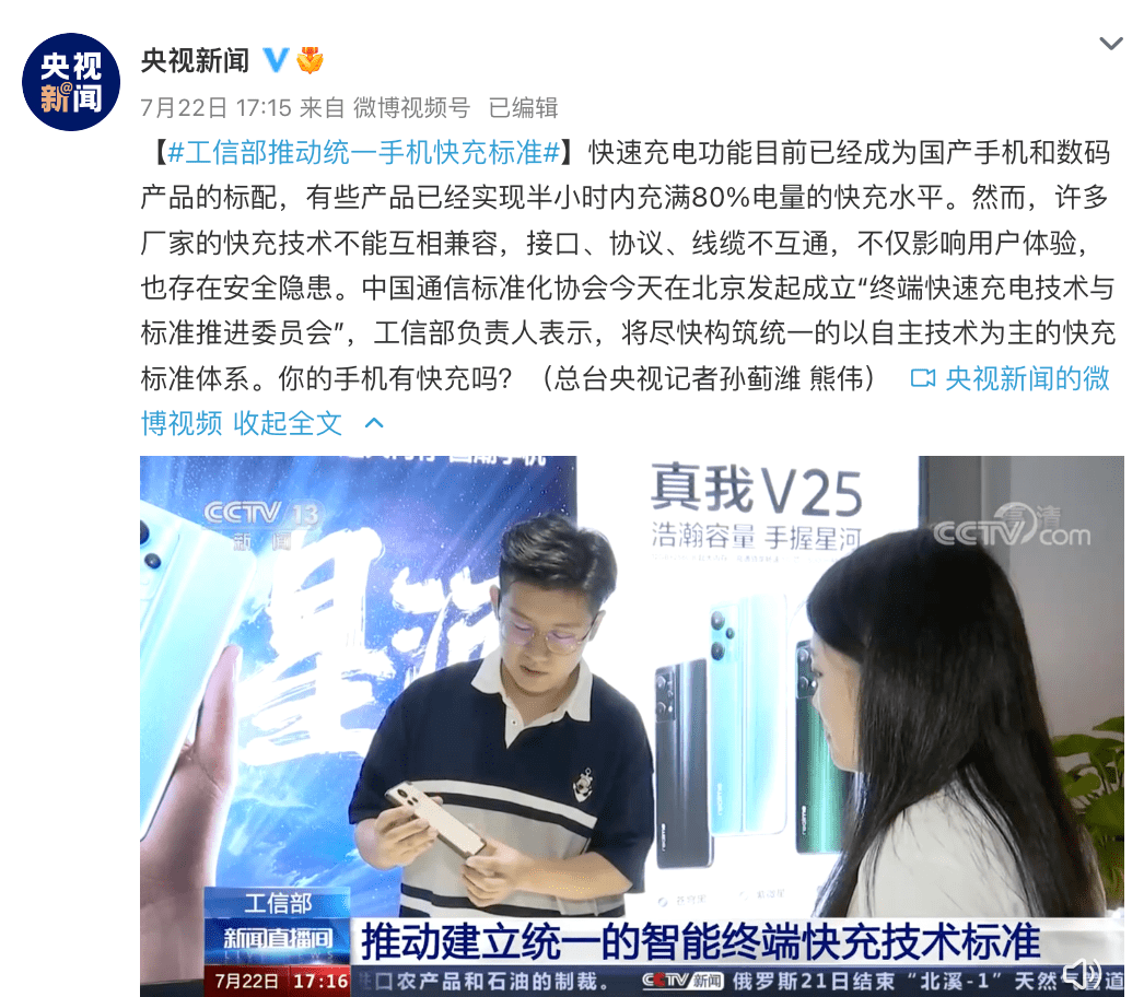 近日,据CCTV新闻报道,“工信部推动统一手机快充标准。快速充电功能已成为国内手机和数码产品的标志,一些产品在半小时内达到80%的快速充填率。然而,许多制造商的快速填充技术互不兼容,接口、协议和电缆不兼容,不仅影响用户体验,也存在安全隐患。中国通信标准化协会今日在北京启动了“提高终端快速充电技术和标准委员会”。工信部负责人表示,以自主技术为基础的统一快速填充标准系统将尽快建成。