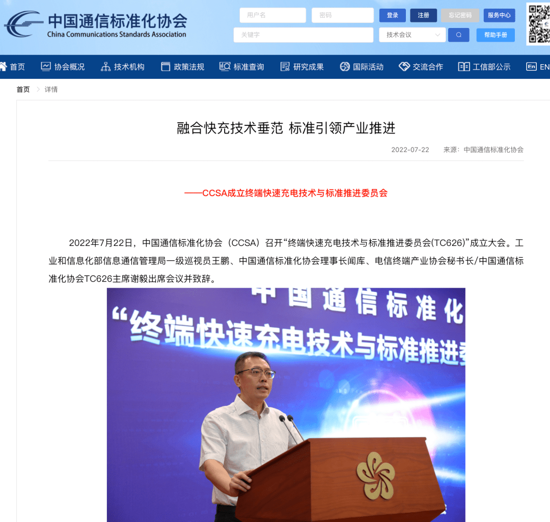 根据中国电信标准化协会的网站,“中国电信标准化协会三个协会、电信终端工业协会和广东省终端快速充电工业协会联合成立了“促进终端快速充电技术和标准委员会”,旨在为快速的终端融合提供机会,聚合产业上下游,综合终端充电技术模型,为业界建立统一、权威的快速收费标准体系,同步推进全球合作和标准互认,提高充电设备的兼容性,为消费者提供更好的用户体验,促进绿色低碳工业发展。