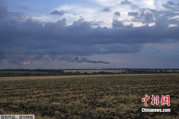 2022年7月22日,在东乌克兰的多涅茨克地区,一个农场在发电厂的背景。