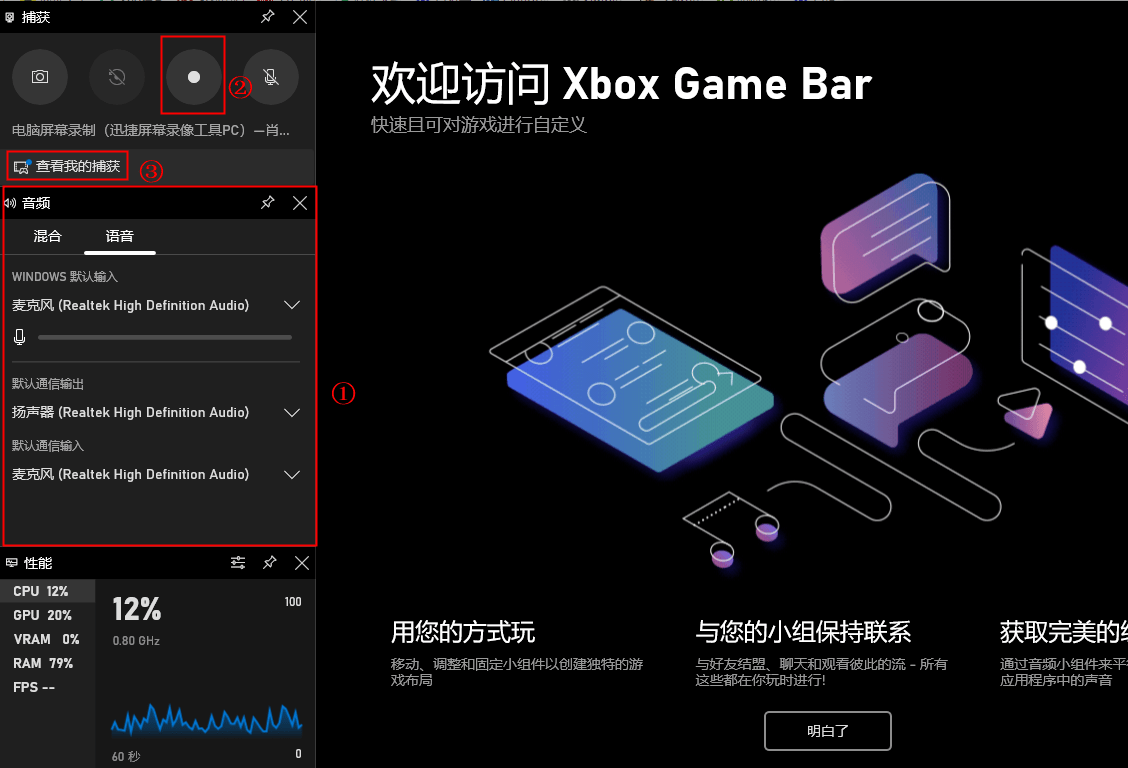 同时,按win+G键拨号,然后设置音频模式,无论是否打开麦克风,然后按小圆形图标开始录音,然后在录音后,你可以在View My Capture中查看完成的视频。