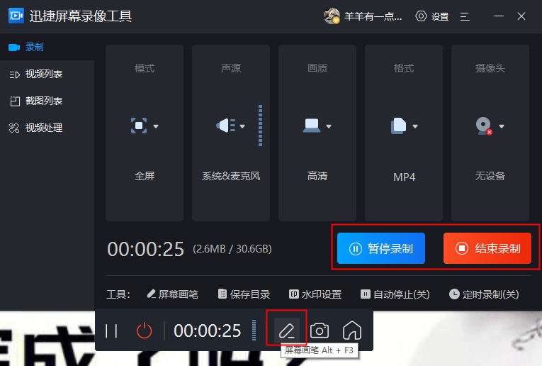 步骤2:在录音过程中,我们可以使用屏幕画家进行实时评论和圆圈选择,为了让观众更容易注意到和理解你所说的话,完成录音,单击[结束录音],你可以在视频列表中查看。如果你需要朋友,他们也可以参与视频处理,分割和合并视频等等。