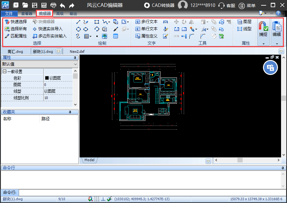 需要对CAD图纸进行编辑的话,可以点击“编辑器”按钮,在下面的编辑器一览中选择需要使用的画图工具。还可以在下方的命令行中输入快捷键命令,有不知道的快捷键命令的话可以使用浏览器进行搜素。