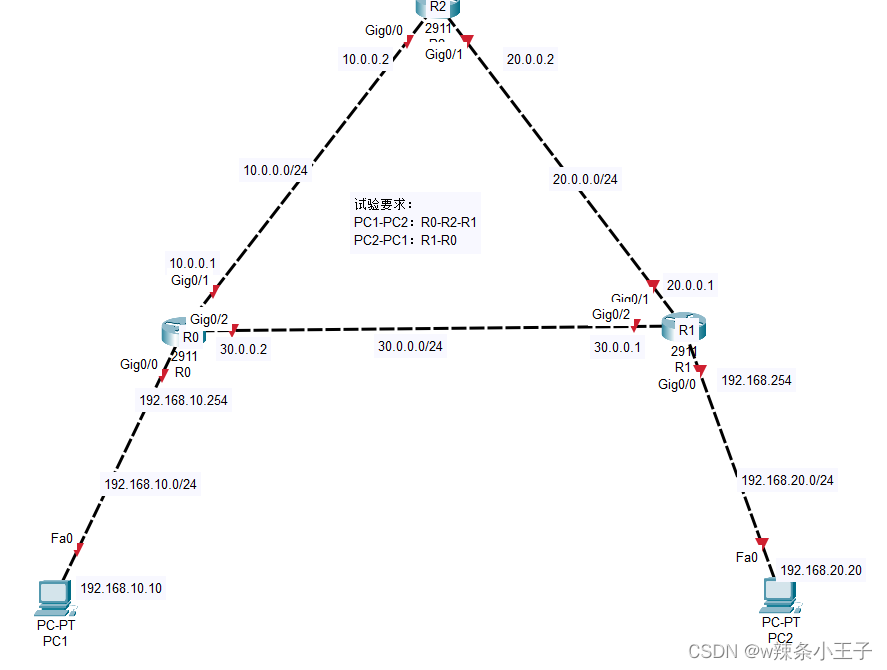 默认路由使用场景:一般用于末节(末梢)网络,网络的最末端(一个路由器的一端,之连接了一个网络。比如:R1的左侧)静态路由是直接指定目标为任何地方