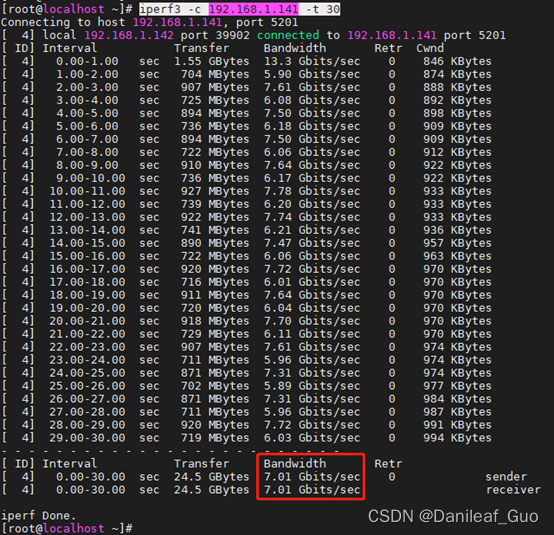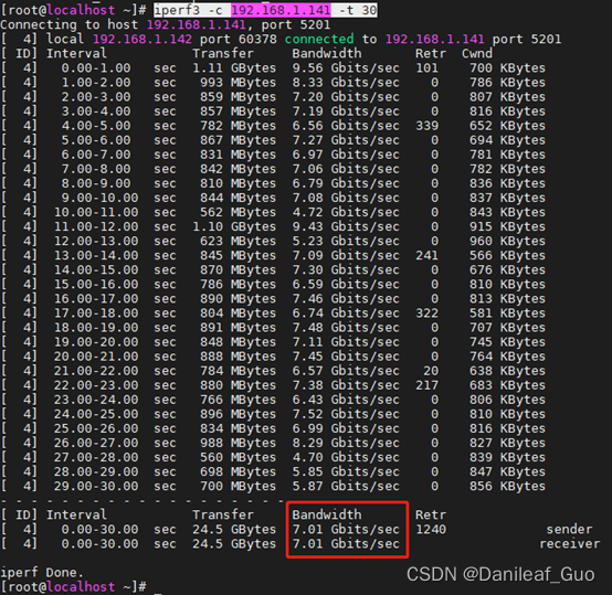 同样,首先使用适配器类型E100e主机141作为服务器,运行测试,带宽7.01Gbps。