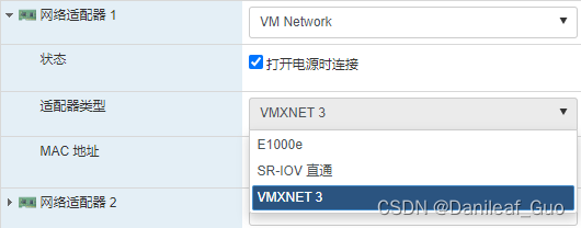 其实这个是和配置主机时选择的适配器类型相对应的,适配器类型选择VMXNET3,在主机上看到的就是VMXNET3;如果选择的是E1000e,显示就成了82574L了。