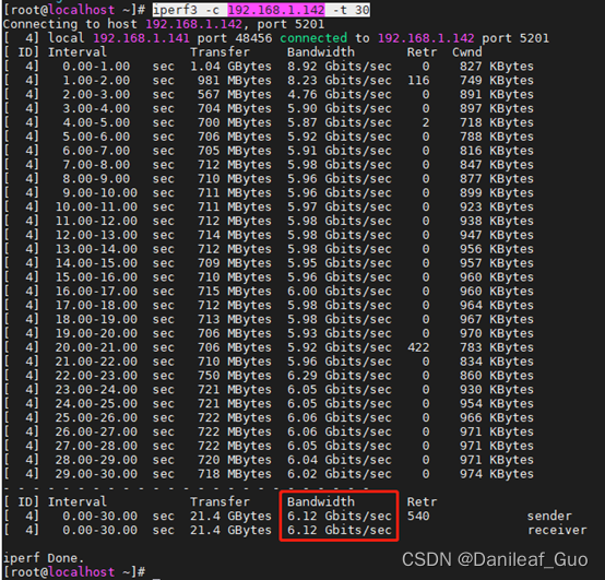 首先,适配器类型为E100e主机142作为服务器,运行测试,带宽为6.12Gbps,在前两个测试之间。