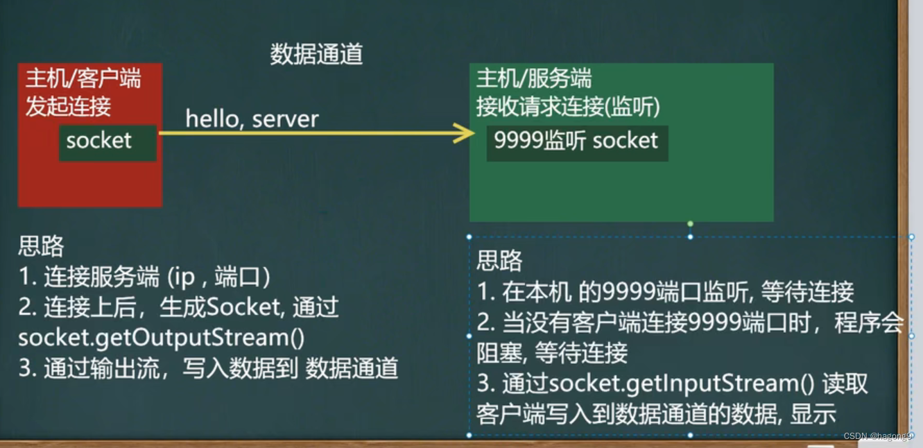连接的 iniciator 通过 Socket 调用 OutputStream 将数据写入数据通道,而接收者通过 Socket 调用 InputStream 读取数据。