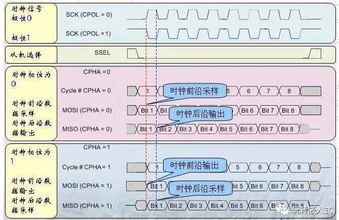 SPI通信有四个不同的方式,在工厂出厂时,设备的不同的配置模式被固定, 这是不能改变的,但这两个通信设备必须在相同的模式下工作,所以你可以配置主设备的SPI模式,主要设备的通信模式由(时钟极度)和(时钟相)控制。