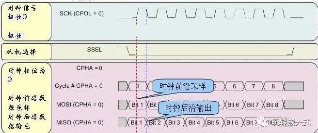 此时空闲态时,SCLK处于低电平,数据采样是在第1个边沿,也就是SCLK由低电平到高电平的跳变,所以数据采样是在上升沿,数据发送是在下降沿。