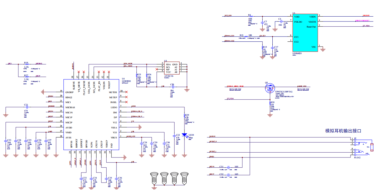 接下来我们看看到底是如何实现边充电边听歌的呢?我们研究了一些产品,拆开并发现里面有两个主要的IC芯片,一个是,音频芯片负责数字信号传输模拟信号到耳机输出音频,另一个是PD协议芯片,负责PD协议与移动电话的通信。