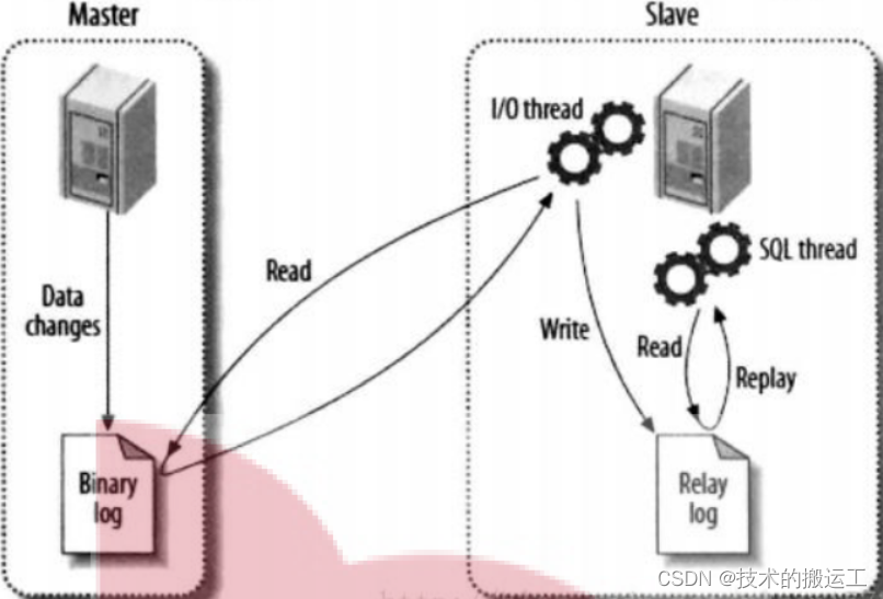 主库(Master)每次数据变更的时候,都会写入到 二进制日志文件 Binary log 中然后从库(Slave)会启动一个 I/O线程(I/O thread)去读取主库(Master)里面 二进制的日志文件 Binary log读取过来之后,它就会写入到 从库(Slave)对应的 日志文件 Relay log 中然后 从库(Slave)中有一个专门的 SQL 线程(SQL thread)去读取 Relay log 日志文件读取过来之后,根据 Relay log 日志的内容,把相应的命令在我们的 从库(Slave)中操作一遍,相当于把我们主库中的数据,全部同步到了从库中