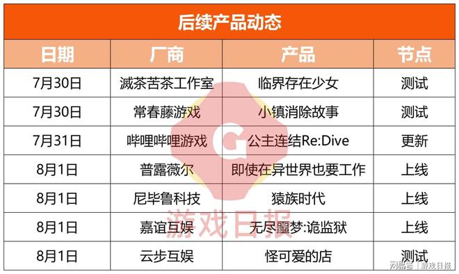 本周游戏日报推荐关注的重点产品详见表格,如需交流请联系后台。
