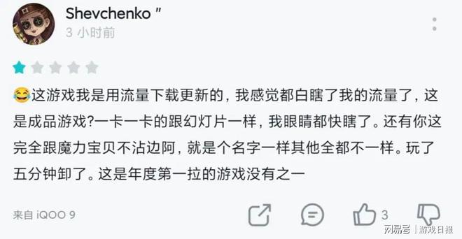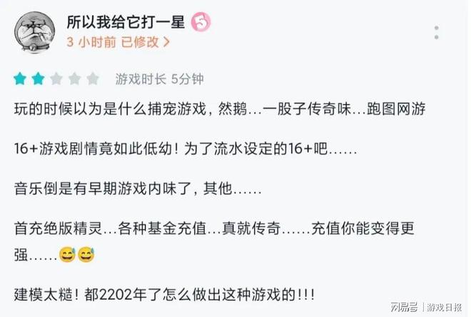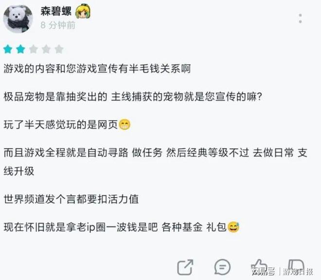 另有玩家表示,以为是“捕宠”,结果是传奇。虽然音乐表现不错,但是游戏建模粗糙剧情低幼,氪金方面则是一应俱全。