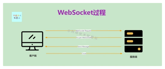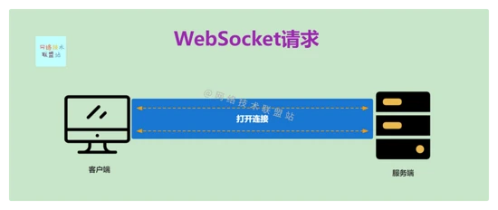 WebSocket手动连接客户端到服务器,握手过程与TCP握手过程相似,握手后,通道保持打开状态,那么客户和服务端可以保持持久的沟通,服务器可以独立地向客户端发送数据,而无需客户端请求。