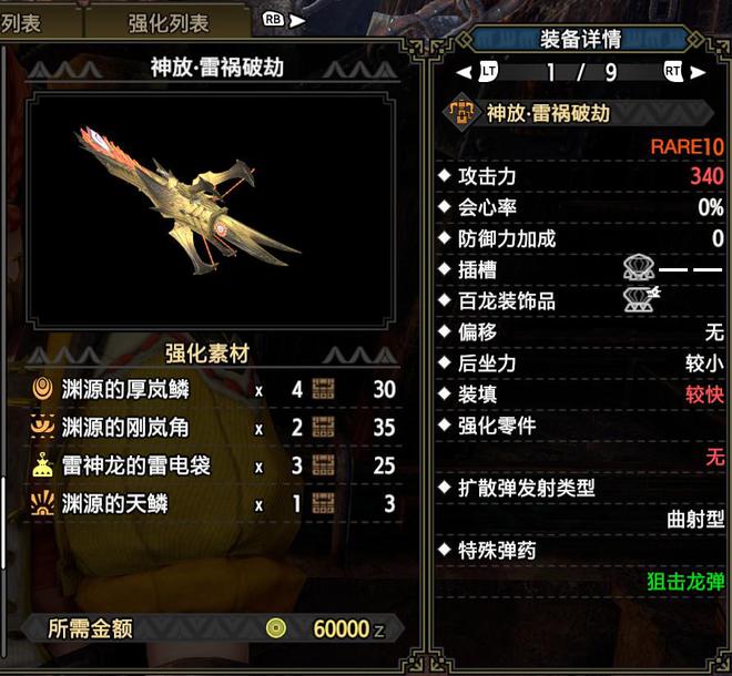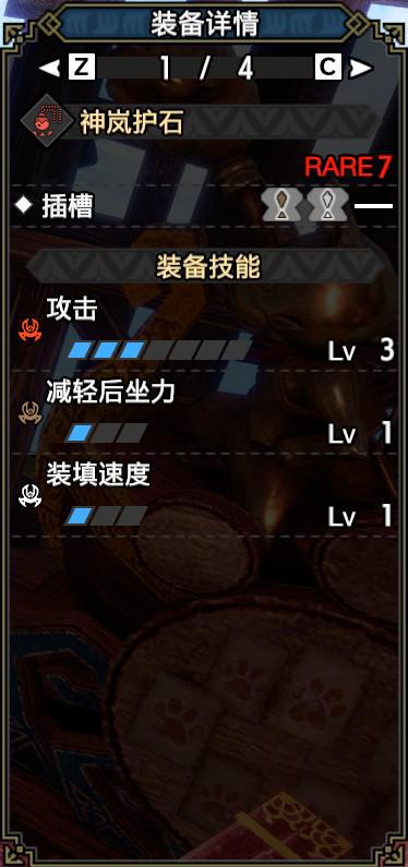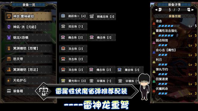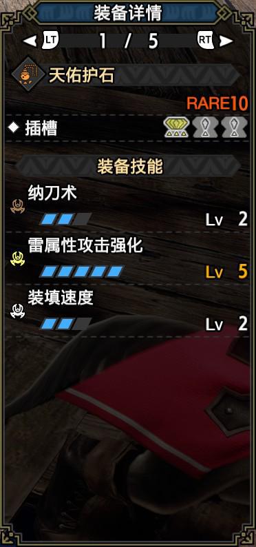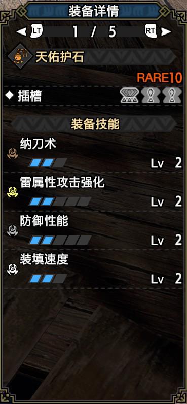 技能:攻击5,雷属性5,弱点特效3,会心击【属性】3,利刃3,弹丸节约3,回复速度3,伏魔耗命3,怨恨2,匠2,纳刀术2,装填扩充2,装填速度2,回避距离提升2,减轻后坐力1,翔虫使1,连击1