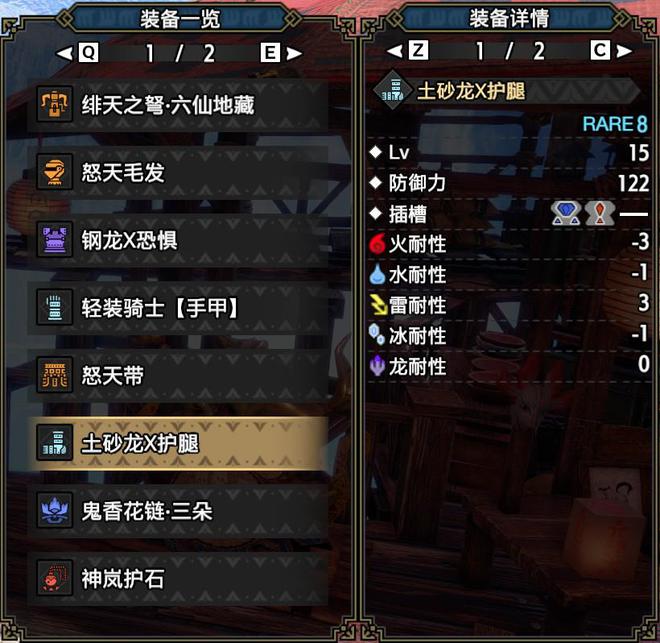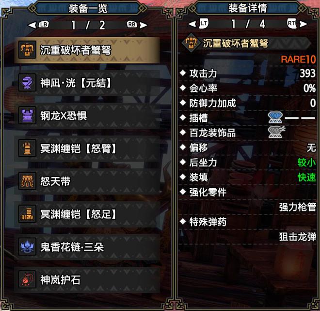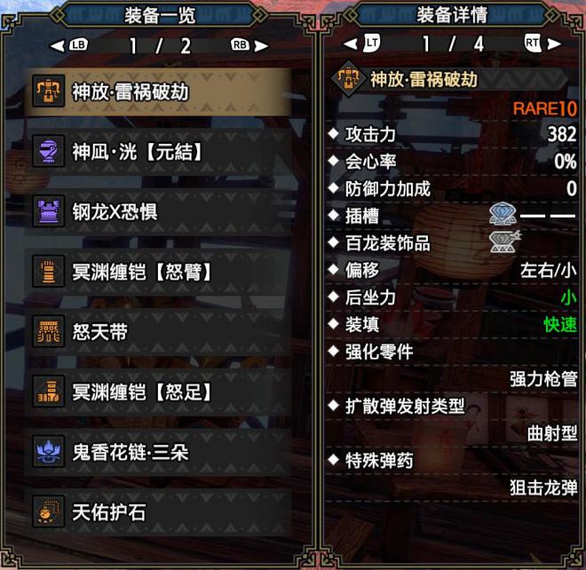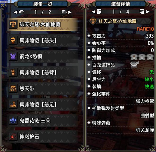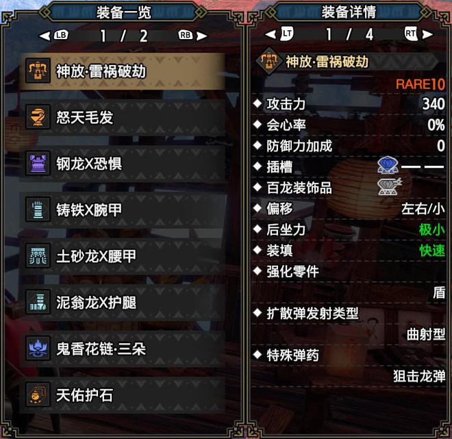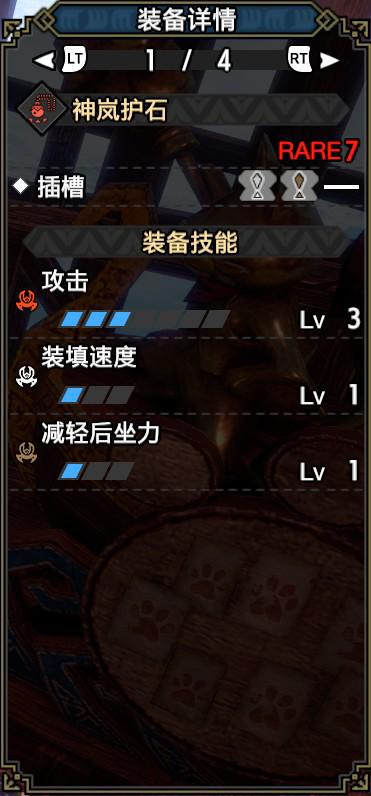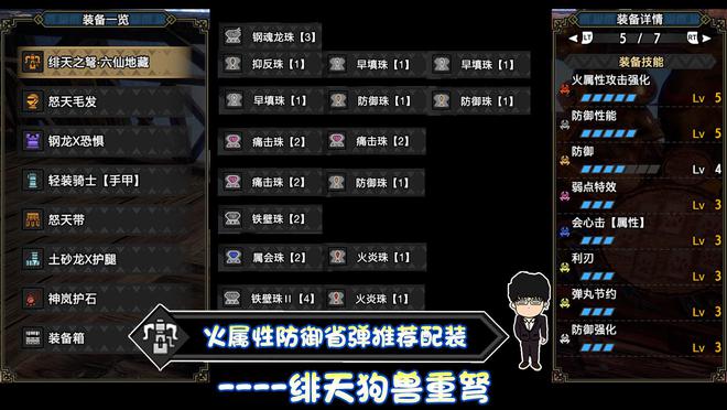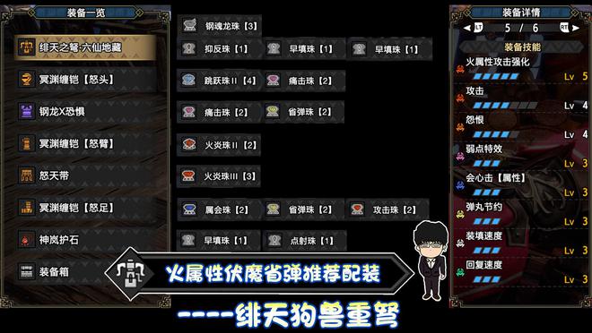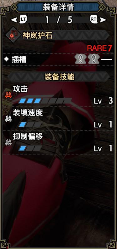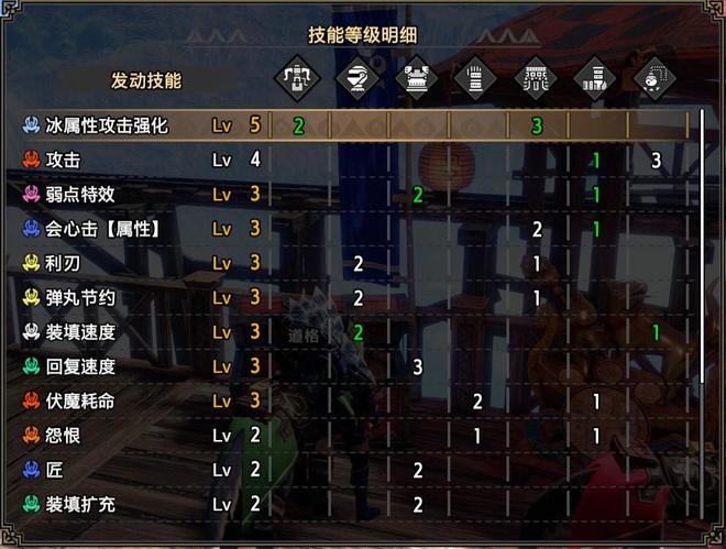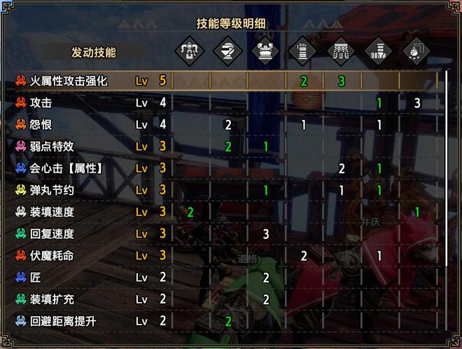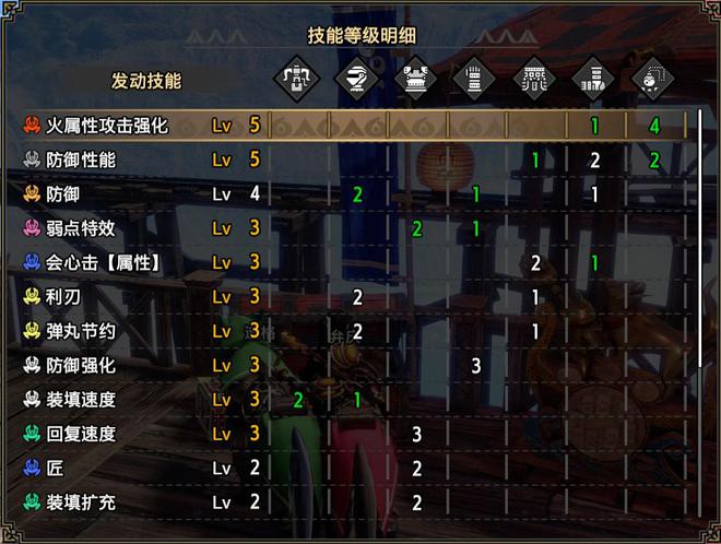 技能:火属性5,攻击4,怨恨4,弱点特效3,会心击【属性】3,弹丸节约3,装填速度3,回复速度3,伏魔耗命3,匠2,装填扩充2,回避距离提升2,利刃1,减轻后坐力1,分散抑制1(可由后座力减少代替),连击1