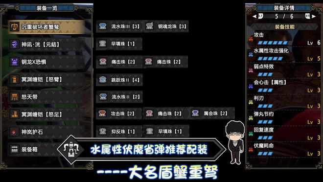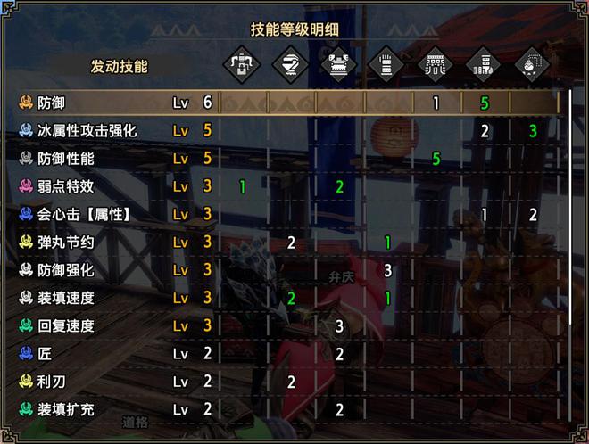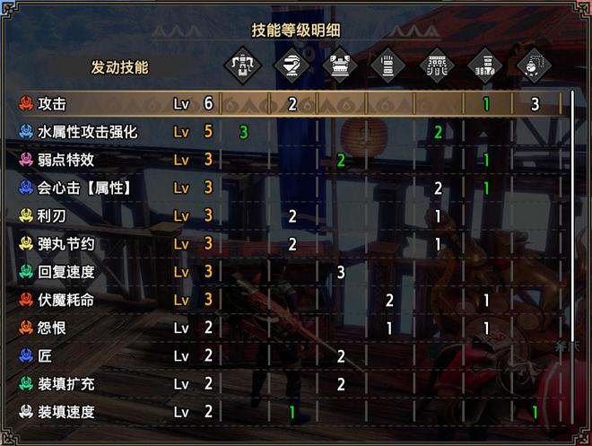 技能:攻击6,水属性5,弱点特效3,会心击【属性】3,利刃3,弹丸节约3,回复速度3,伏魔耗命3,怨恨2,匠2,装填扩充2,装填速度2,回避距离提升2,减轻后坐力1,翔虫使1,连击1