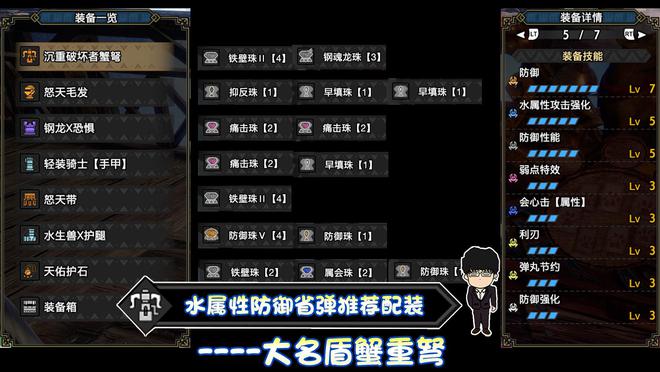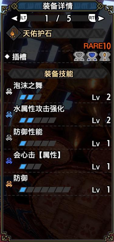 技能:防御7,水属性5,防御性能5,弱点特效3,会心击【属性】3,利刃3,弹丸节约3,防御强化3,装填速度3,回复速度3,匠2,装填扩充2,泡沫之舞2,减轻胆怯2,看破1,减轻后坐力1,激昂1,连击1