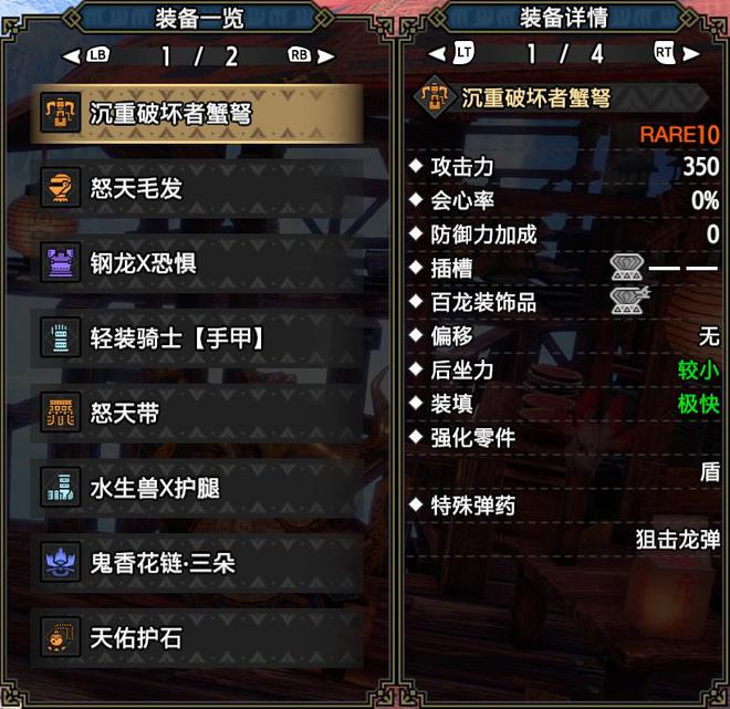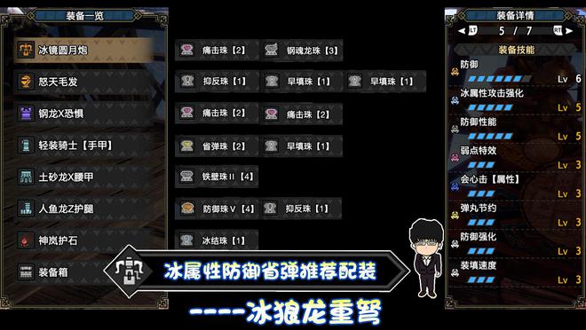 接下来,让我们谈谈配置思想,防护性能+防护增强+防护+防护反应速度+猫食+烤鱼可以保证狩猎,15%+弱点特征350%+破损15%=有效的网站70%会发现,水属性 + 心跳属性 + 弹药储蓄 + 填充扩充 + 联合射击保护损伤