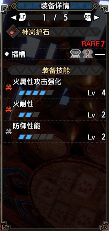 技能:火属性5,防御性能5,防御4,弱点特效3,会心击【属性】3,利刃3,弹丸节约3,防御强化3,装填速度3,回复速度3,匠2,装填扩充2,火耐性2,减轻胆怯2,看破1,攻击守势1,减轻后坐力1,激昂1,连击1