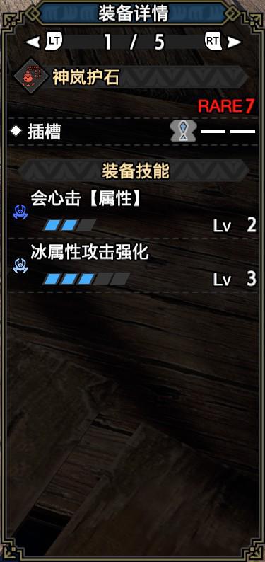 技能:冰属性5,攻击4,弱点效应3,心脏攻击[属性]3,刀剑3,弹药储存3,包装速度3,恢复速度3,燃油破坏3,怨恨2,大师2,包装扩展2,避免距离增加2,观察1,减轻后座1,压制偏见1,强化1,加入攻击1