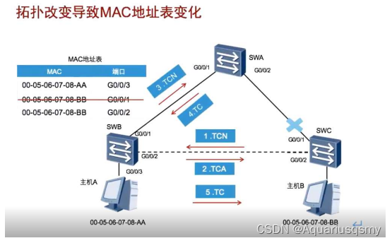 TCNBPDU-本地交易所链故障后,STP将重新收敛,为了加快交互机的MAC地址表的更新,将发送到所有本地的STP接口哦,CNBPDU,邻接开关接收TCNBPDU,然后返回TCA位置1配置BPDU,用于可靠性传出,随后,TCNBPDU被转移到根网桥上,基于根网桥的TC标记位置1的BPDU配置,随后分发给所有交换商,所有交换机在收到后将临时转换300S MAC地址老化时间为15S